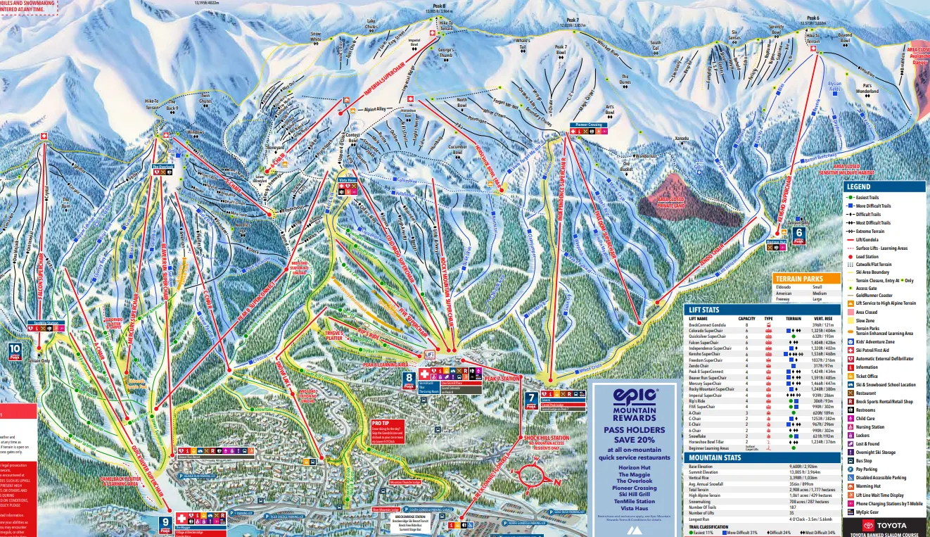 In winter, Breck’s Five Peaks are home to 187 trails for skiing and riding, plus a whole bunch of take-your-breath-away, above-treeline terrain that offers views for days. Below is a winter trail map for reference. For more detailed info, you can check the official website.