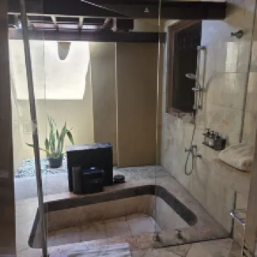 Room: I had a wonderful Alam villa – a huge space with an endless woven ceiling and a large terrace. The bathroom was uniquely designed: partly indoors and partly open-air. Everything felt very traditionally Balinese: lush greenery, a stone bathtub, and floral green robes. It was cleaned every day.