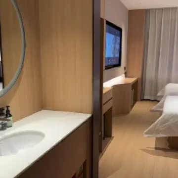 This hotel is super conveniently located near Beijing West Railway Station. They provide disposable face towels, and on the first floor, you can find earplugs and portable laundry detergent, which is really great. The room was clean and tidy, and I appreciated the smart toilet and lighted makeup mirror. It's a shame that the robot couldn't deliver items directly to the room because of the steps; I had to go to the staircase to pick them up, which was a minor inconvenience. The air conditioning in the room was a bit noisy, but thankfully, the free earplugs came in handy. Despite these small issues, the value for money is excellent. Highly recommend!