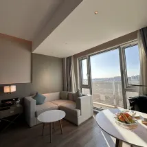 The hotel is newly built, and the facilities are relatively new. The suite I booked had a separate living room and dining area, and the bathroom was also spacious. Rooms are delivered by robots, and the swimming pool on the first floor provides a fun space for children. The basement parking lot has ample spaces and also offers charging stations. It's an 8-minute drive from the Joy City and Sam's Club, making it a convenient place to stay.