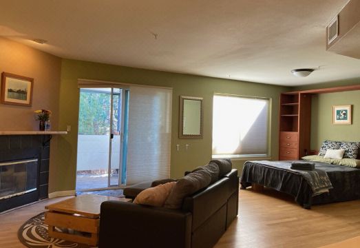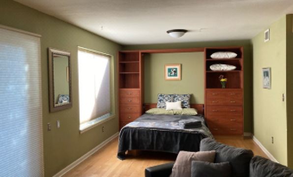 Primary bed is a queen size Murphy bed. There is also a sleeper sofa. Note that the unit is a studio, and as such, the bedroom area is not private from the living room.