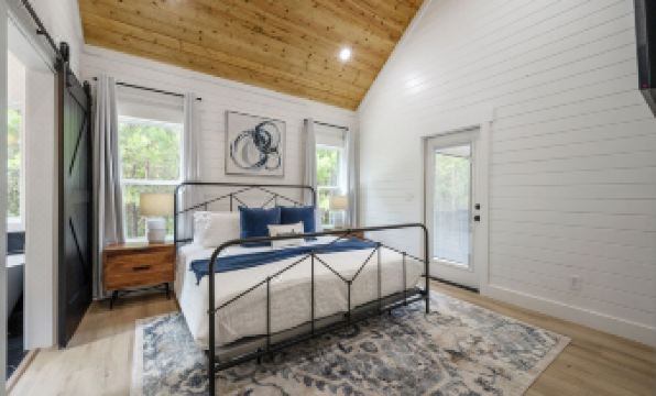 The cabin features two king bedrooms, each equipped with a smart TV and private ensuite bathroom for added comfort and privacy. A cozy loft offers a queen Murphy bed and a selection of games—ideal for kids or extra guests—while the living room includes a queen sofa bed for additional sleeping space.