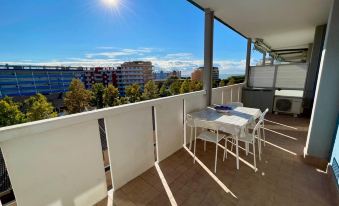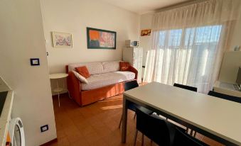 One-bedroom flat situated on the 5th floor of a building with lift, only 330mt from the sea. The property features a spacious balcony with a partial sea view, an open plan kitchenette, a dining/living room with a trundle bed, a bedroom with a double bed plus a single bed, and a complete bathroom with shower (curtains). It can host up to five guests, and one uncovered parking spot is included. A/C is available at an additional cost (check below).