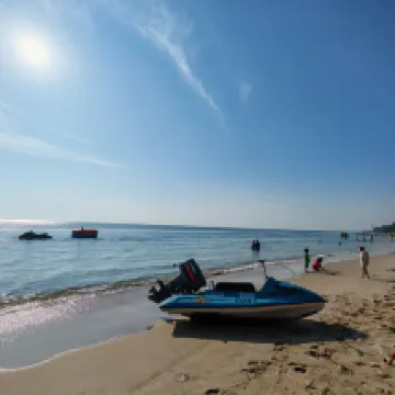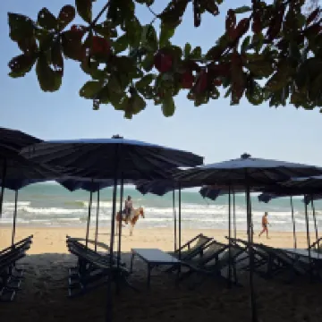 The hotel is located across the road from the beach. The beach is sandy. There aren't many people. There are plenty of places nearby where you can eat European cuisine. It's a place for a quiet holiday and enjoying life. There are many elderly people around.