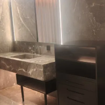 The room has a makeup mirror, and the bathroom is very spacious with a large mirror. The natural light during the day is excellent, and the facilities are complete. The bathroom also has a separate wet and dry area, with the shower cabin separately enclosed.