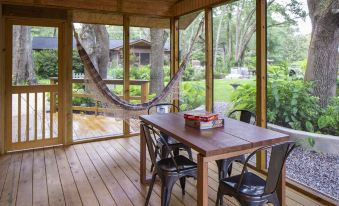 Beautiful cottage surrounded by lovely landscaping. Just a 10 minute drive to the beach and roughly 15 minutes to downtown Charleston. You will enjoy spending time in this 1 bedroom, 1 bath cottage right in the center of James Island. From the time you pull in the driveway, you will notice the attention to detail. Pack your bags for a trip to Charleston! The property is fully equipped with a full kitchen, washer/dryer, sheets, towels. In addition, there is toilet paper and paper towels. While staying at this property, you will enjoy the screened in patio with a dining table for 4. There are also two comfortable chairs for sipping your morning coffee on the porch. When you feel like going to the beach, don’t bother packing your beach chair as there are 2 chairs along with boogie boards and beach towels. When you come home from the beach, you may even want to use the outdoor shower! Very private shower and the back of the house. In the evenings, whether you want to go out or stay in, there are tons of restaurants close by. However, when you feel like staying in, there is a grill at the property and a perfect area outside great for cooking out and enjoying the exterior features of this home.