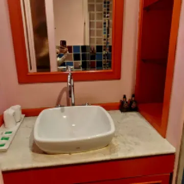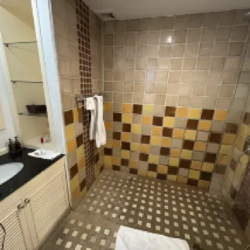 The bathroom, jacuzzi size bath was great, but the water flow was not uniform, pump system and water fluctuated from hot to too hot or warm to cold. The water spilled around the edge of the wall causing a huge puddle of water in the middle of the floor in the bathroom.