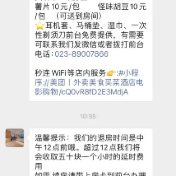 The hotel is still quiet, the wifi mobile phone signal is extremely poor, there is no 5G mobile phone signal, and the service is poor. The hotel requires check-out at 12 o'clock, and charges 50 yuan per hour for non-check-out.