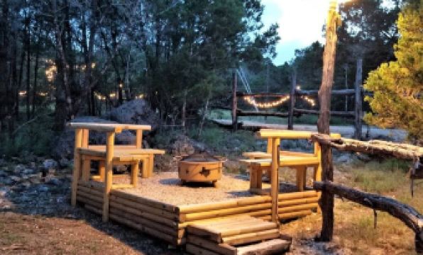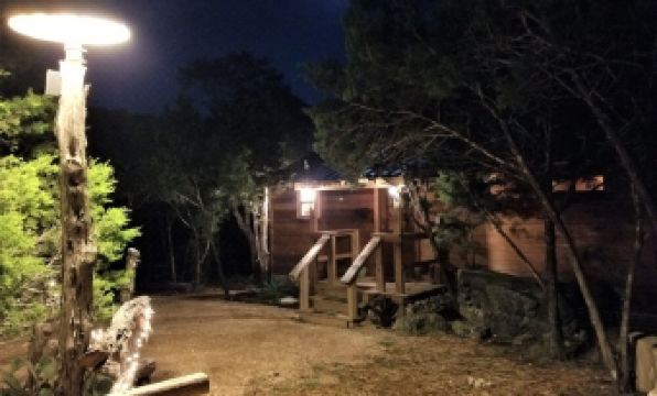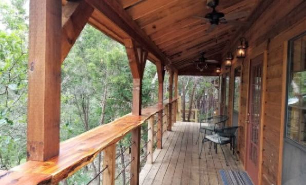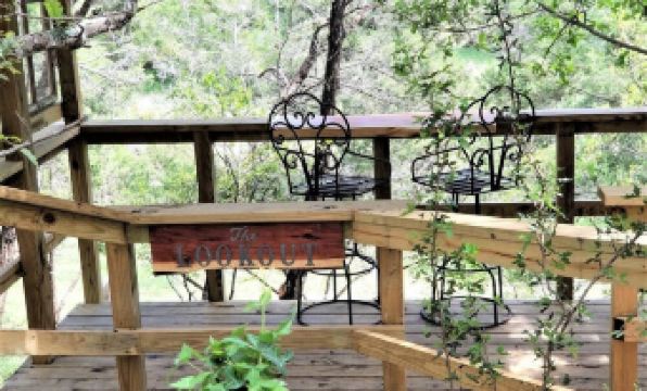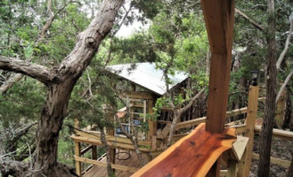 Come and relax with us in your own private cabin in the treetops nestled on the bluff overlooking the creek bed and surrounded by the Texas countryside.