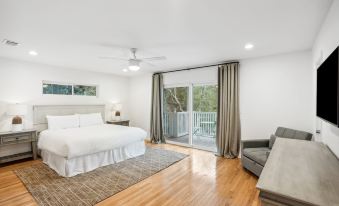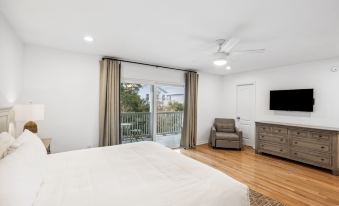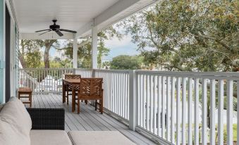 Step into the main living area, where an open floor plan and an inviting atmosphere with beachy decor await. Sink into plush seating, throw your favorite show on the large flat-screen TV, and make yourself at home. Adjacent is the dining area and kitchen, featuring an island with 5 barstools for additional seating. The modern kitchen is fully equipped and boasts stainless steel appliances, making it a breeze to whip up your group's favorite home-cooked meal.