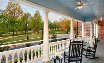 Large front porch. If you get a 1st floor room the shutter windows don’t keep out the light. Annoying. Plus—room was near the in/out door. You hear everyone exit…especially in the AM. I booked through a 3rd party at a discount. I think they give their downscale rooms to such. For an allegedly 1st class place I thought, too, that it was a little bit chincy to require a dang ticket for a cup of coffee. It was nice—but for those issues.