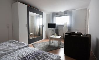 L'alloggio ha un buon rapporto qualità prezzo, e si trova in una posizione comoda per chi si sposta in auto dall' Germania alla Danimarca. C'è anche la possibilità di usare la cucina. Per il resto, i bagni sono piuttosto approssimativi, ricavati in un angolo di una cantina, con griglie di legno al posto di pareti divisorie. La porta di uno di essi non si chiudeva, e la privacy non è assicurata. la nostra camera si trovava nel seminterrato di una villetta nella zona industriale di Flensburg, in mezzo ai capannoni. Manca completamente qualsiasi isolamento acustico, se avete vicini rumorosi o che arrivano tardi/partono presto...auguri! Se arrivate dopo le 20, portatevi del cibo perché nei dintorni non c'è nulla (pessima esperienza con il Burger King che, tra l'altro, é l'unico posto aperto)