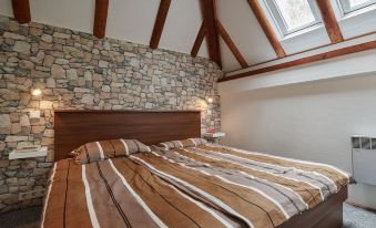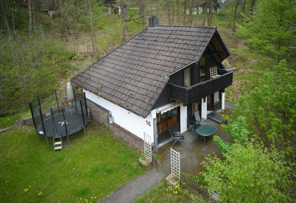 Holiday village "Frankenau", surrounded by trees and meadows. Outside the resort, 2 km from the centre of Frankenau, in the district Nationalpark Kellerwald, on a slope, 28 km from the lake. For shared use: natural state property, pond. In the complex: restaurant with TV, kiosk, sun terrace. Bread roll service. Grocery 8 km, restaurant 2 km, bakery 2 km, bicycle rental 15 km, bus stop 400 m, railway station "Frankenberg" 15 km, outdoor swimming pool 6 km, indoor swimming pool 15 km, thermal baths "Bad Wildungen-Reinhardshausen" 20 km, bathing lake 12 km. Golf course (18 hole) 25 km, indoor tennis centre 400 m, gondola lift 27 km, fishing possibilities 700 m. Nearby attractions: KellerwaldUhr 500 m, Schloss Waldeck 27 km. Well-known ski regions can easily be reached: Winterberg 45 km, Willingen 50 km. Well-known lakes can easily be reached: Edersee - Herzhausen 13 km. Hiking paths: Nationalpark Kellerwald 500 m. Please note: suitable for families. Neighbourhood highly sensitive to noise. Quietness and good behaviour expected. Some of the holiday homes can be reached via steps. At the park entrance there is a bistro/café with a sun terrace, Sunday breakfast buffet, children's cinema, table football (limited opening times outside of the season). There is also the option of using a washing machine and dryer for a fee. "Tischlein, deck dich", 4-room house 75 m2 on 3 levels. Partly renovated in 2021, cosy and wooden furniture furnishings: open living/dining room with dining nook, digital TV, flat screen, radio and wood-burning stove. Exit to the terrace. Upper floor: 1 room with sloping ceilings with rooflight with 1 double bed (2 x 90 cm, length 190 cm), TV. With sloping ceilings, open kitchen (oven, dishwasher, 4 ceramic glass hob hotplates, microwave, electric coffee machine). Shower/WC, sep. WC. 2nd upper floor: 1 room with sloping ceilings with 1 double bed (2 x 90 cm, length 190 cm). Exit to the balcony. 1 room with sloping ceilings with 2 beds (90 cm, length 190 cm), TV. Exit to the balcony. Electric heating, air-conditioning. Carpet. Balcony, terrace, lawn 100 m2. Terrace furniture. Facilities: logs (extra). Internet (WiFi, free). Parking at 50 m. Please note: non-smoking house. Maximum 2 small pets/ dogs allowed. Smoke alarm, fire extinguisher. Trampolin for shared use. The fireplace is a pellet stove.
