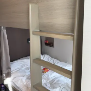 The hotel is conveniently located near Hakata Station, about a 10-minute walk away, right next to the canal. We booked a deluxe quad room on the second floor, which also came with a terrace. The room was spacious, and the two bunk beds were large and very comfortable to sleep in. All essential toiletries were provided. Coffee and tea could be picked up at the front desk. There's a laundry room and an ice machine on the first floor. Great value for money.