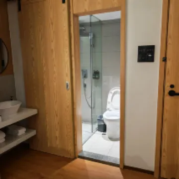 However, the hotel facilities are poorly designed. The main issue is the sink; it's far too small. The water splashes everywhere as soon as you turn it on, leaving the counter and floor soaked. They could easily replace it with a larger sink. The counter space for toiletries becomes completely useless when it's covered in water.