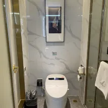 We had a twin room on the 2nd floor. The size was adequate. I liked that the room had brass handles and fixtures and fittings, great antibacterial material. The room had nuts on the floor and at the edge of the bed and other detritus. The room had a semi smart function. A singing shower, single press curtain opening and closing, room sleep mode etc. slippers provided and bathroom toiletries. There was a round sofa with a table. There was a coffee shop downstairs but this never seemed to be open. There is a restaurant on floor 2, which looked ok but never tried it. The top floor had a well known Canton restaurant.