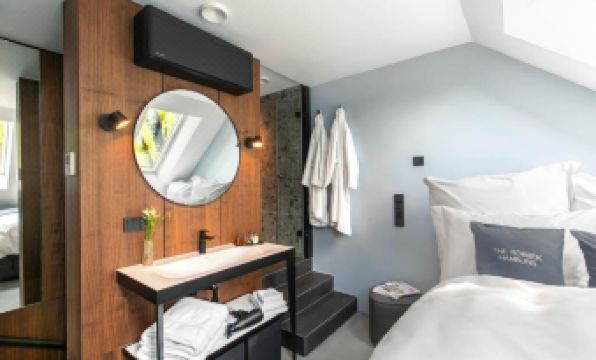 What a great place - this is as good as it gets for a business traveller: The hotel has only recently been opened, it is top modern, clean and stylish design - whichever piece of ultra hip, high end Muuto or Richard Behr furniture you touch, you want it at home ! Best beds in the city, the floating shower is an experience, the wifi is super fast and the small touches such as key less entry via smartphone are super convenient. Service is excellent, this is a great team running the show. The bistro is wonderful, they have separate menus for breakfast, lunch and dinner, and each selection is a find. The gym - officially only now about to be opened - is small, extremely well equipped with the best quality work out devices, and they were as kind as to give me access already. Set on the corner of an old school that has been converted to a luxury living community, between the market, the church and the village center. 20min to the airport, 10min to local train station Altona, and everything else is just around the corner. Great - will definitely return !