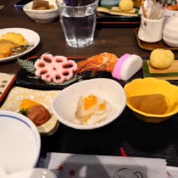The room window faces the Akatori Gate. There is a shuttle service available. The meals are plentiful and delicious. The only downside is that there are no shower facilities in the room. You have to go to a public bathhouse with time restrictions, which means you can't shower after swimming at night.