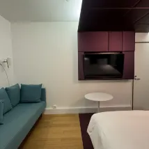 Located next to the train station. Excellent location. Clean room. Rich buffet breakfast. Three people can share a room for a day. Extra bed is free. The extra sofa bed is also very big. Will stay again