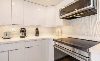 Delight in a remodeled modern kitchen equipped with large capacity, stainless steel refrigerator, oven, microwave, stove and dishwasher, and everything you need to prepare and serve delectable meals.