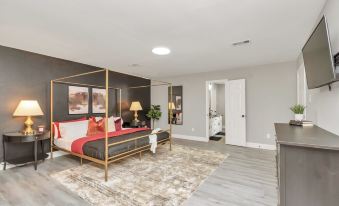 The “main bedroom” is outfitted with a king bed, two bedside tables, a bedside lamps, and a Smart TV.