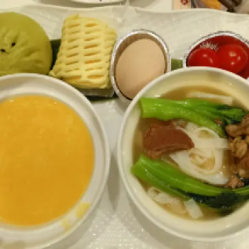 The breakfast is average, with few varieties, only an egg, a small bowl of noodles, a small bowl of porridge, a steamed bun, and a piece of water chestnut cake.