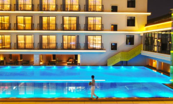 1. **3rd Floor Infinity Pool:** Surrounded by palm trees, the pool water glows at night, with the Gaozhuang nightscape as a backdrop. The ambiance is simply unbeatable.