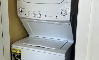 6. A fully stocked kitchen, 2 refrigerators (1/Lg and 1/med), stove, microwave, spices for cooking, many small kitchen appliances, bakeware and cookware, dishes, glasses, utensils, no dishwasher on premises due to kitchen size (antibacterial dish soap and hot water provided). Three paper towel rolls, are provided with each rental. Disposable plates and disposable cups are supplied.