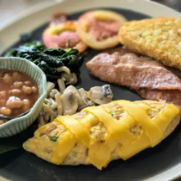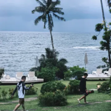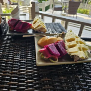 The breakfast is delicious and exquisite, and you can order more if you're not full. The dinner is also very good. You can fish on the rocks near the swimming pool. There's a small beach downstairs from the restaurant. It's very quiet and relaxing, perfect for lounging.