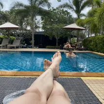 I always like to begin with the positive so here goes. The staff here are very warm, welcoming and friendly. The pool and accommodation areas are kept spotlessly clean and the property also offer competitive motorcycle/moped hire. The rooms are bright spacious and modern with some nice touches like robes, slippers and umbrellas. However it really is a bit of a stretch to call this a resort. The property and pool area are relatively small and they offer no bar/snack service whatsoever and nor is breakfast an option. The lady at reception said it simply hadn’t been worth it since Covid. I really think they should be offering something as if you are lying at the pool and fancy a drink/snack you face a walk across a very busy road to the 7/11. Not ideal at all. The other big negative is the steep stairs to the upper floors (no lift). We chose to stay on the top floor as we wanted a view and are reasonably fit. However even we found it a struggle at times and if you’ve had a few drinks be careful. If you have mobility issues you’ll need to be on the ground floor or look elsewhere. All in all we enjoyed our stay here though and with a few facility improvements this would easily score higher.
