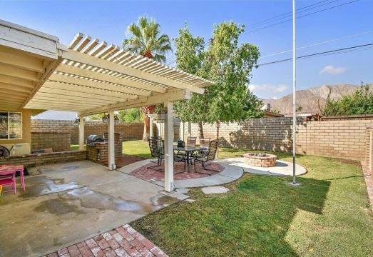 The relaxing backyard has views of the surrounding mountains in the La Quinta cove. Twinkle lights on trees and around the patio perimeter create a tranquil space to decompress under the stars.