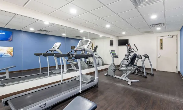 The fitness center contains three pieces of equipment and a total gym. Nice except the elipitical didn’t work and the television didn’t work.
