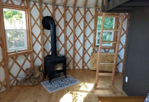 what to expect: the yurt was literally just finished. The cabin is spotless too. However, both are rustic cabins not hotels. Because they have a composting toilet, because they’re heated with wood, because the property is accessed via a chip path not an asphalt one, invariably sawdust, wood flecks, and the occasional spider web make their way inside. The country will follow you indoors. Please visit expecting that. In the interest of keeping the place tidy we ask that guests remove their shoes before entering. You’ll have to walk about 75 yards from your car so… make sure those shoes are comfortable. Both the cabin and yurt sleep two couples each. House broken, well-mannered pets welcome. Expect a location that’s off the beaten path and, consequently, not super easy to find. But for ours, there are no houses in sight. Relevantly, our house is next door. (See photos.) We are quiet folks and you’ll likely hear little but the rustling trees and nearby spring.