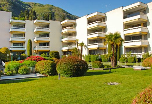 Locarno - Monti: Beautiful, comfortable apartment house "Residenza Solemonte", built in 1980, renovated. On the outskirts, in a quiet, sunny, elevated position, in the countryside. For shared use: property, park, lawn for sunbathing, beautiful garden to relax, indoor pool angular heated (20 x 6 m, depth 140 - 140 cm) with internal staircase. Shower/WC in the pool area, outdoor shower, table tennis, patio, terrace. In the house: sauna (extra). Fitness room, playroom, washing machine (extra), tumble dryer (for shared use, extra), drying room. Motor access to the house. Public parking on the road extra. Shop, grocery, restaurant, café 200 m, bus stop, railway station "Locarno - Muralto SBB-CFF". Golf course (18 hole) 7 km, walking paths from the house 50 m, cable car 700 m. Nearby attractions: Ascona, schöner Wochenmarkt am Dienstag, Brissago Inseln, Piazza Grande, Locarno, Falconeria, Locarno, Madonna del Sasso, Ronco s/Ascona, Mercato: Cannobio IT, Intra IT, Luino IT, Ponte Tresa IT. Well-known lakes can easily be reached: Lago Maggiore, Lago di Lugano, Lago di Como. Hiking paths: Cardada, Monte Bré, Centovalli, Valle Verzasca, Val Resa, Valle Maggia, Monte Tamaro-Splash and SPA, Monte Lema. Please note: baby equipment on request (extra). , Please note: The indoor pool is closed for annual cleaning from approx. 01.02. – 20.02. "Vista Panorama", 1-room apartment 50 m2 on 3rd floor, south facing position. Spacious and bright, renovated in 2019, comfortable and modern furnishings: open large living/sleeping room with panoramic window with 1 french bed (160 cm, length 200 cm), dining table and cable TV (flat screen). Exit to the terrace. Large, open kitchen (oven, dishwasher, 4 ceramic glass hob hotplates, toaster, kettle, freezer, electric coffee machine, Capsules for coffee machine (Delizio)) with dining table. Shower/WC. Electric heating. Large terrace 25 m2. Terrace furniture (2). Marvellous panoramic view of the lake, the mountains, the valley, the countryside and the resort. Facilities: iron, children's high chair, baby cot for up to 2 year olds (extra), hair dryer. Internet (WiFi, free). Please note: non-smokers only, no parking. NL-00005181