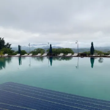 A gorgeous hotel, situated on a hill with a beautiful view of the surroundings. The pool is magnificent with a comfortable water temperature. The rooms are perfect, absolutely nothing to complain about. Each room has a tea set with capsule coffee and tea. There was also a very pleasant welcome treat of delicious pastries. A minivan runs to and from the city center every hour, from early morning until 10 PM.
