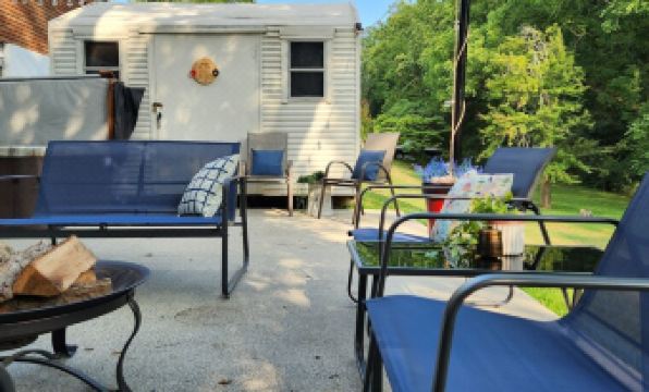 BACK PATIO: Side door leading down to our back patio with a 5-person hot tub. Plenty of outdoor seating including an eating area. Complete with a fire pit, BBQ (limited, propane supplied) grill and hanging lights.