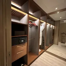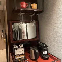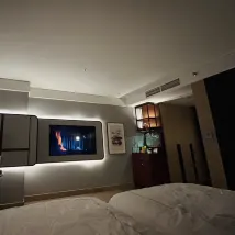 😊Club guest room was super nice and spacious. Had a walk in closet, 3 way bathroom, smart toilet, good shower, tub with a view, double lavatory, big vanity. Had space for a 3rd bed. Coffee, soda, Perrier and Evian. Coffee table with fruits and sweets . Remote control blinds and curtains. USB plugs at bedside. Window view of the pool and hills. Could have stayed in the room all day .