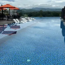 😊 Pool was nice , had several depths, lounge chair submerged partially in the water, cabanas , lovely view from the infinity edge.