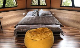 The diamond shaped treehouse itself consists of a 22 square meters area including a queen size bed that sleeps two which is the most we can host. Bed covers, pillows and blankets are provided. What could be better than falling asleep in the trees and waking up to birds singing around you?