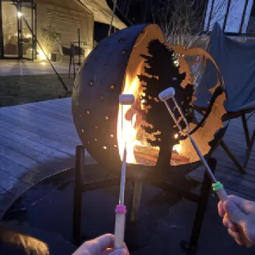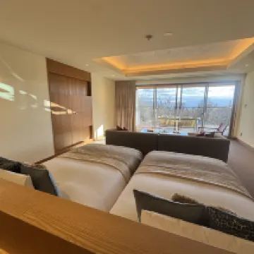 The room was very spacious, and the complimentary cake and snacks were delicious. The hotel surroundings are beautiful, and in winter, there's a bonfire where you can roast marshmallows, making it perfect for a family trip. Many small details were a nice touch, like the yuzu bath.