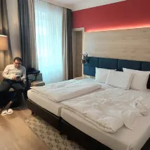 It's close to Munich's Hbf, with restaurants and a pharmacy nearby, which is convenient. The bed was large, but the pillows were a bit firm. We booked a business twin room, which had a spacious living area between the room and the bathroom. The slippers were comfortable, and the front desk was very helpful.