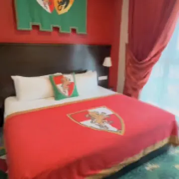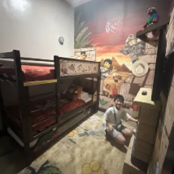 good experience。 hotel room theme knight. Kid love it very much. Inside got one master bed and 1 bunker beds for kids. Hotel room is clean and hygiene. Inside have a box of Lego blocks for kids.