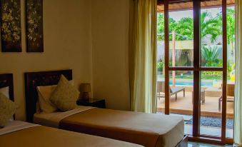 We stayed for 3 nights and had a very relaxing time at the villas. The owners welcomed us as we arrived which was nice who are from Belgium. The swimming pool is nice and also relaxing. The rooms are fantastic inside, the rooms were very spacious and the shower was outside. The private garden as the villa was amazing and we wished we had more time to spend there! Would recommend for a small family and also couples! Alona beach is about a 15-18minute walk down to the beach but access is very easy by calling a Tuk Tuk from reception.