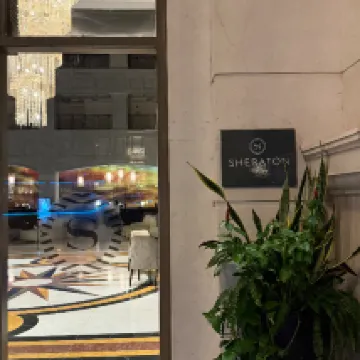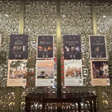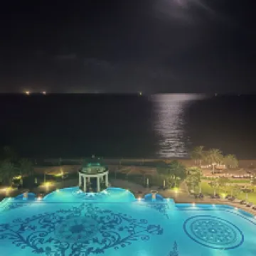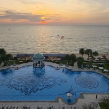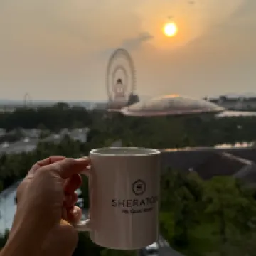 This is an old-school Sheraton, but the food is absolutely delicious, and there are some shows worth watching. The service is decent, though the facilities are definitely a bit dated and not quite up to scratch. The sea view is fantastic, and I really liked the floor layout. The vintage-style transparent capsule elevators are totally my thing! And the sunset over the hotel's private beach in the evening? Simply stunning!