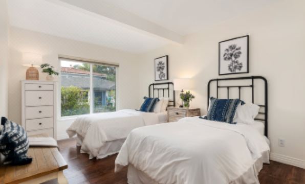 East Beach Bungalow (Back unit) - This cozy cottage will accommodate up to six people with queen-size beds in two bedrooms and a third room with two twin beds, each dressed in fresh coastal colors. A hall bathroom has a large walk-in shower, a soaking tub, and dual sinks. The living room, with television, also features seating in a sunny window for curling up with the latest Santa Barbara Magazine to see where to go next. Or sit down to a delicious meal at a dining table inside or out. Grilling on the patio is always a great option on warm nights, and the detached laundry room off the garage with a full bathroom is easily accessed from this tropical patio. (Link to full profile)