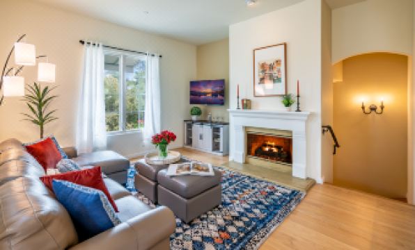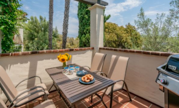 Enter the house at street level from the attached garage, a rare commodity in this part of the city. Then, ascend the stairs to the main salon with vaulted ceilings, television, a supple grey leather sectional/sofa sleeper, and a fireplace that adds an element of warmth and coziness to the home. After preparing a delicious feast in the kitchen, the dining room or the covered terrace with barbecue and a table for four offer the perfect landing for any meal. With a pretty "Juliet" balcony overlooking the colorful, bougainvillea-studded Spanish-style complex, the home's primary suite has a king-size bed, and an attached bathroom with a luxurious oval soaking tub, a spacious shower, and a walk-in closet. The second bedroom features two twin beds. The laundry room and a hall bathroom with a shower complete the conveniences offered, but this is only the beginning to a memorable stay.