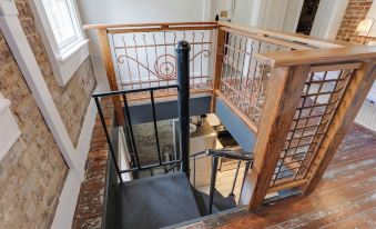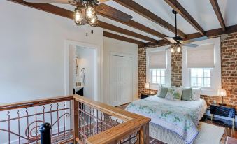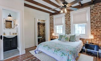 The bathroom is beautifully appointed with modern amenities, while still maintaining its historic charm. The bedroom features a comfortable queen-size bed, ensuring a restful night's sleep.