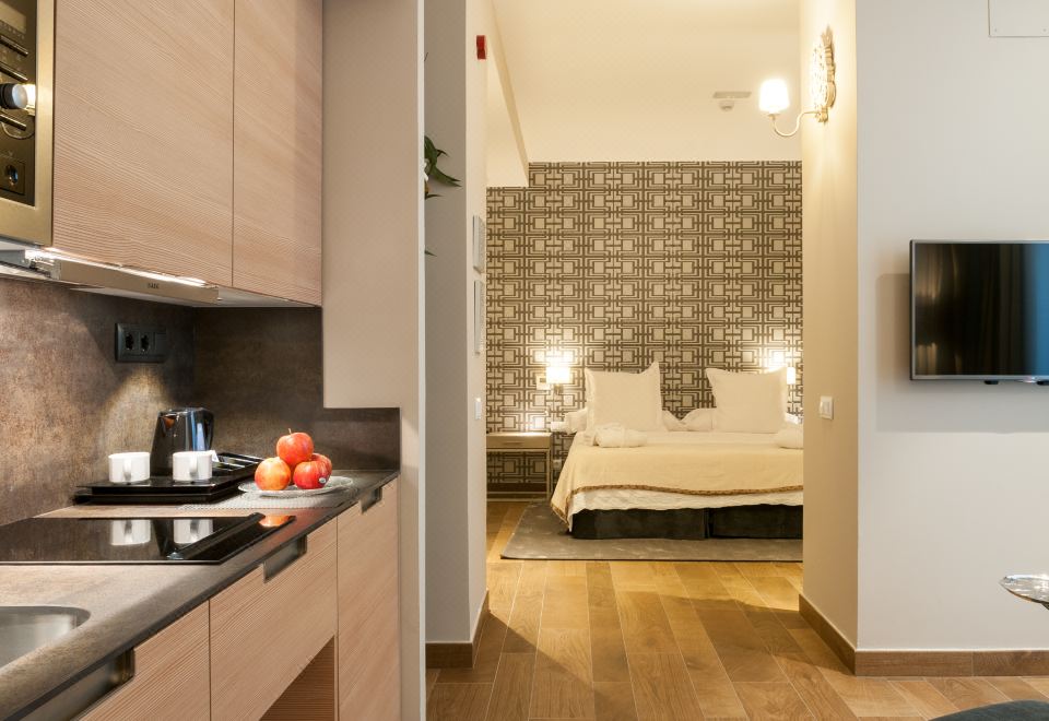 The hotel is located in a small alley in the old town. The room is a small suite with a kitchen. Although it is next to the cathedral, the sound insulation is very good..