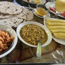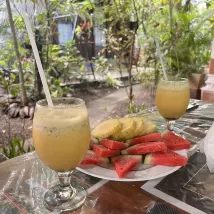 Breakfast was a variety of options, including roti, pancakes, fruit and juice, and everything was delicious.