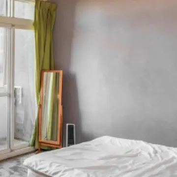 The shower and bedroom have an industrial style—this is a matter of personal preference.